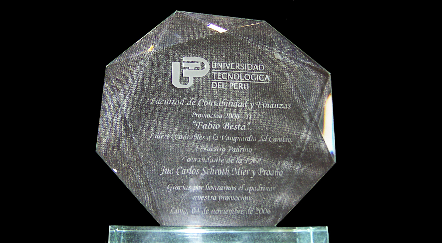 Se entregará dos recordatorios en cristal, grabado arenado o labrado, con el logotipo de la Universidad y el texto de grabación que la Promoción elija.